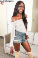 Loving the denim mini-skirt and top Finessa starts off in, in this second set of her, with the knee length boots just making the overall look complete - sexy, provocative and accessible (with panties just showing upskirt). She's soon naked and showing some of the sexiest, most gorgeous, dark, smooth, flaweless skin I've seen in a longwhile, and with that bit round perfect ass, and thick thighs, nice breasts and everything else that this dynamic new model has going on, then she's just a sight to behold.